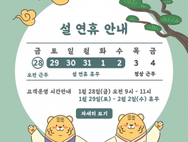 설 연휴로 인하여 연휴 전날인 2월10일 단축근무 일정과 설 연휴 일정에 고객지원 업무 운영시간에 대한 안내를 드리오니 이용에 참고 부탁드립니다.